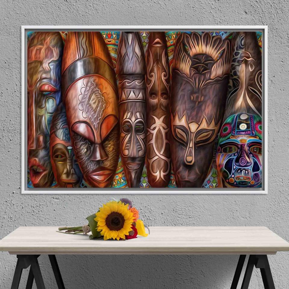 งานศิลปะบนผ้าใบพิมพ์ลายหน้ากากแอฟริกันโทนสีน้ำตาลหรูหรา - ของตกแต่งสมัยใหม่ ผ้าใบกรอบสีขาว