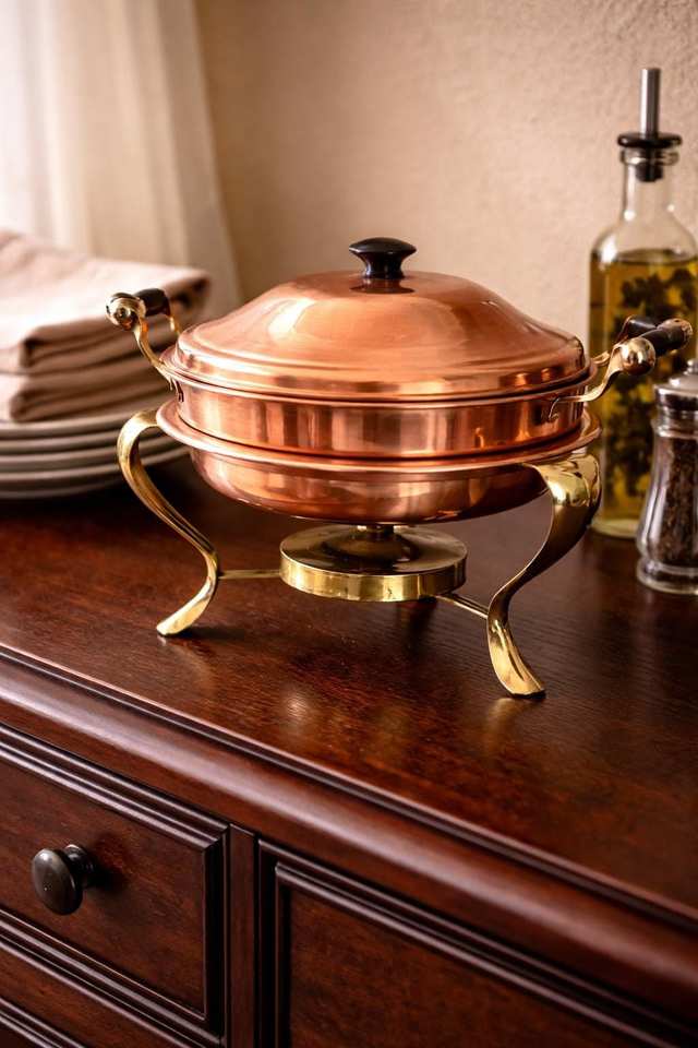 ถาดอุ่นอาหารบุฟเฟ่ต์ทองแดงดีไซน์หรูหรา พร้อมฝาปิดตกแต่งและโครงสร้างแข็งแรง สำหรับงานจัดเลี้ยง ร้านอาหาร โรงแรม และงานเลี้ยง