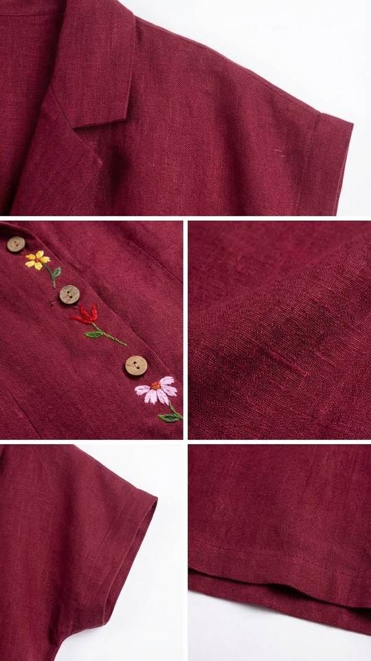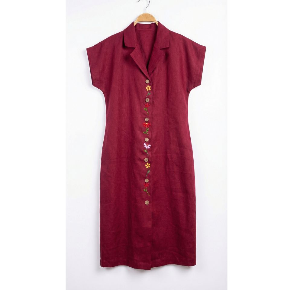 ชุดเดรสผ้าลินินสีเบอร์กันดีสุดหรู พร้อมลายปักดอกไม้และกระดุมด้านหน้า ชุดเดรสแขนสั้นทันสมัยสำหรับผู้หญิง