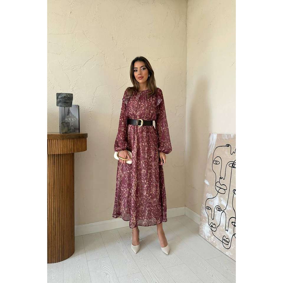 เดรสชีฟองสีแดงเบอร์กันดีทรงหลวม แต่งระบาย ดีไซน์สวยหรู เอวธรรมชาติ เหมาะสำหรับใส่ในชีวิตประจำวัน ผ้าบางเบา