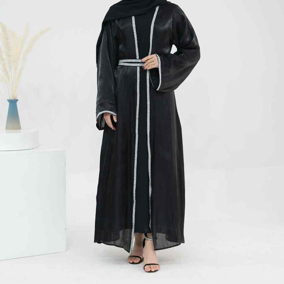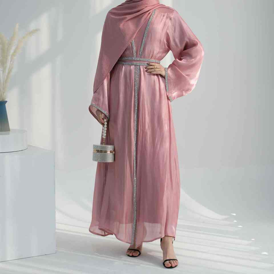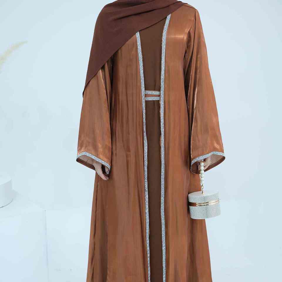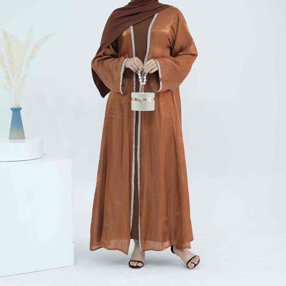 ชุดอาบายะห์มุสลิมทันสมัยสไตล์แชมเปญสุดหรูสำหรับผู้หญิง ดีไซน์เปิดด้านหน้าแบบดูไบ เรียบร้อย สบายๆ น้ำหนักเบา ระบายอากาศได้ดี ยาวคลุมถึงพื้น ช่วงเอวเข้ารูป