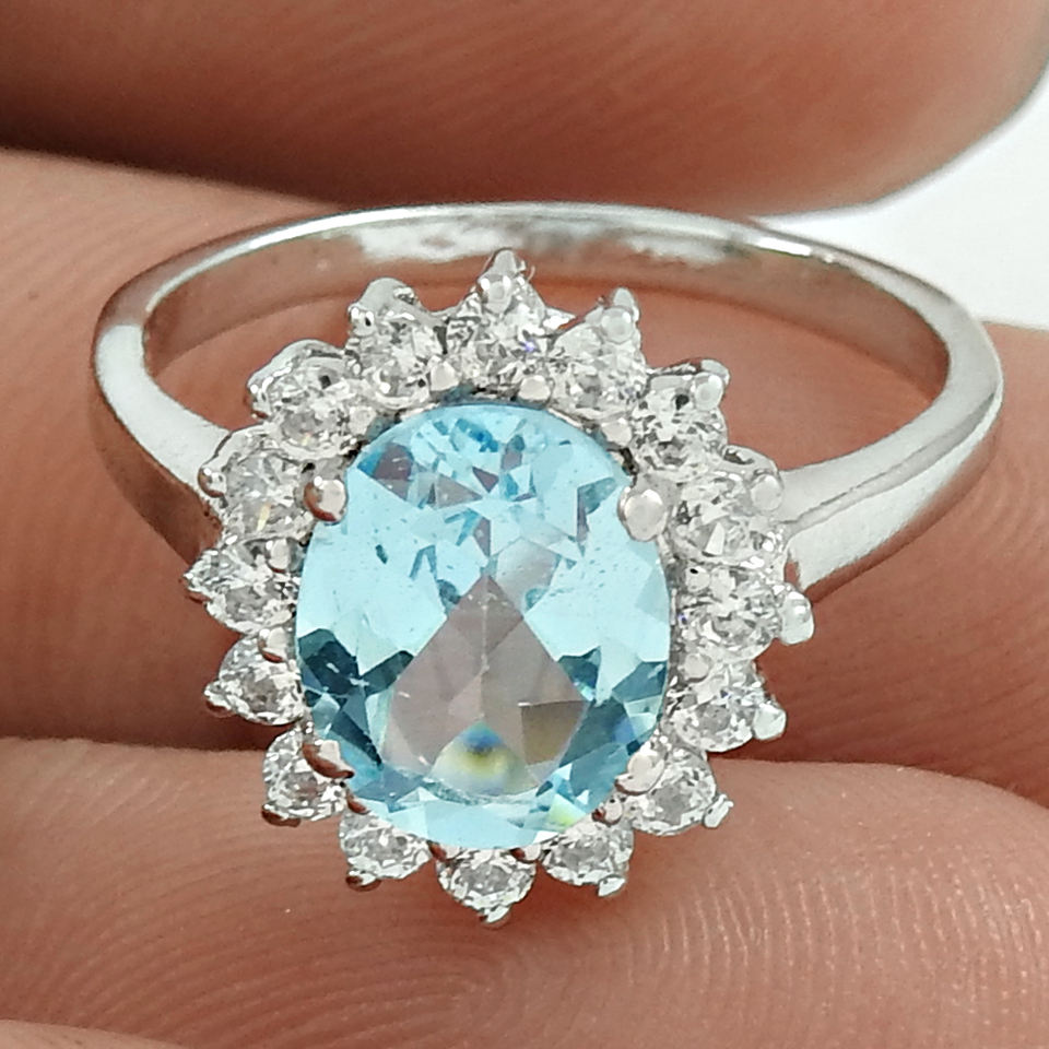 แหวนหมั้นสุดคลาสสิกสง่างาม S925ดีไซน์ทันสมัยแหวนพลอยโทแพซสีฟ้าแบบเรียบง่าย