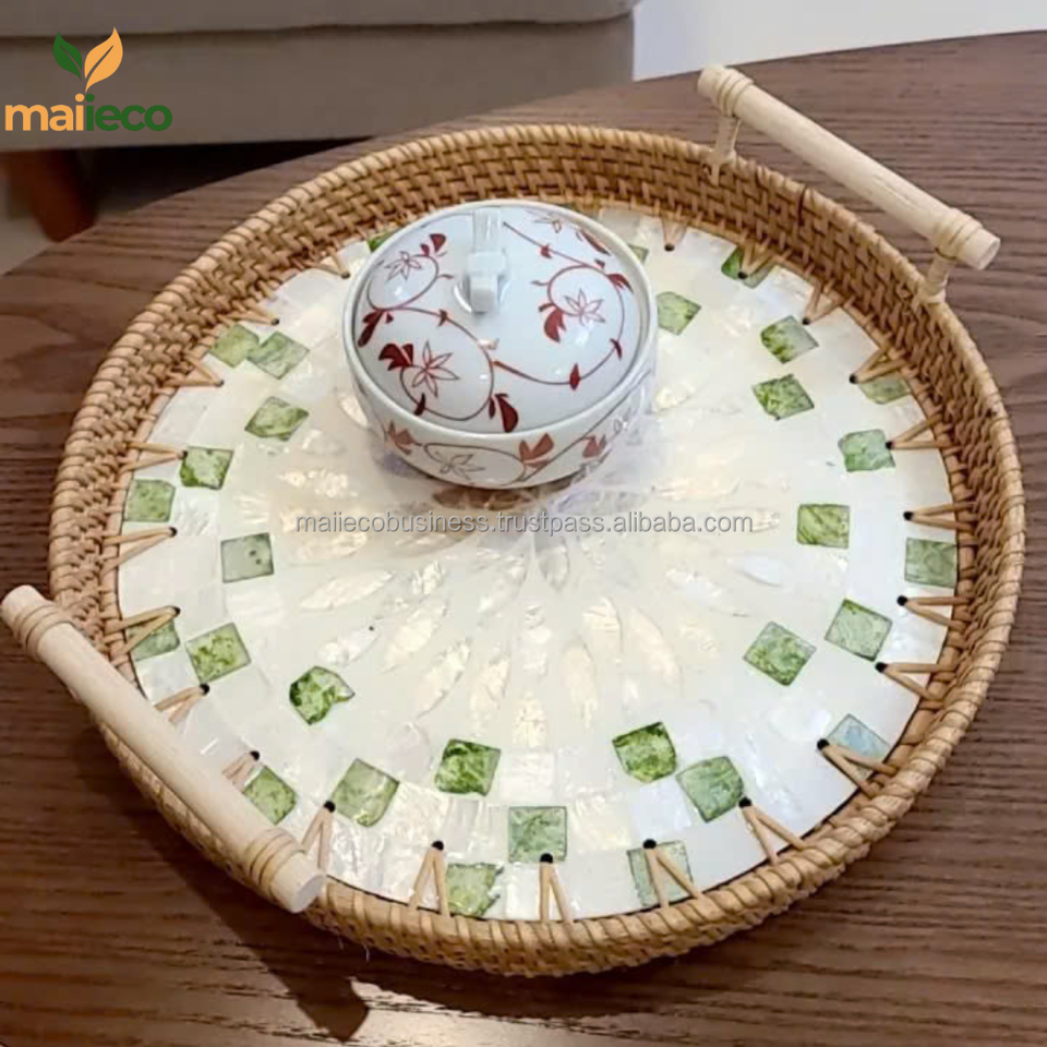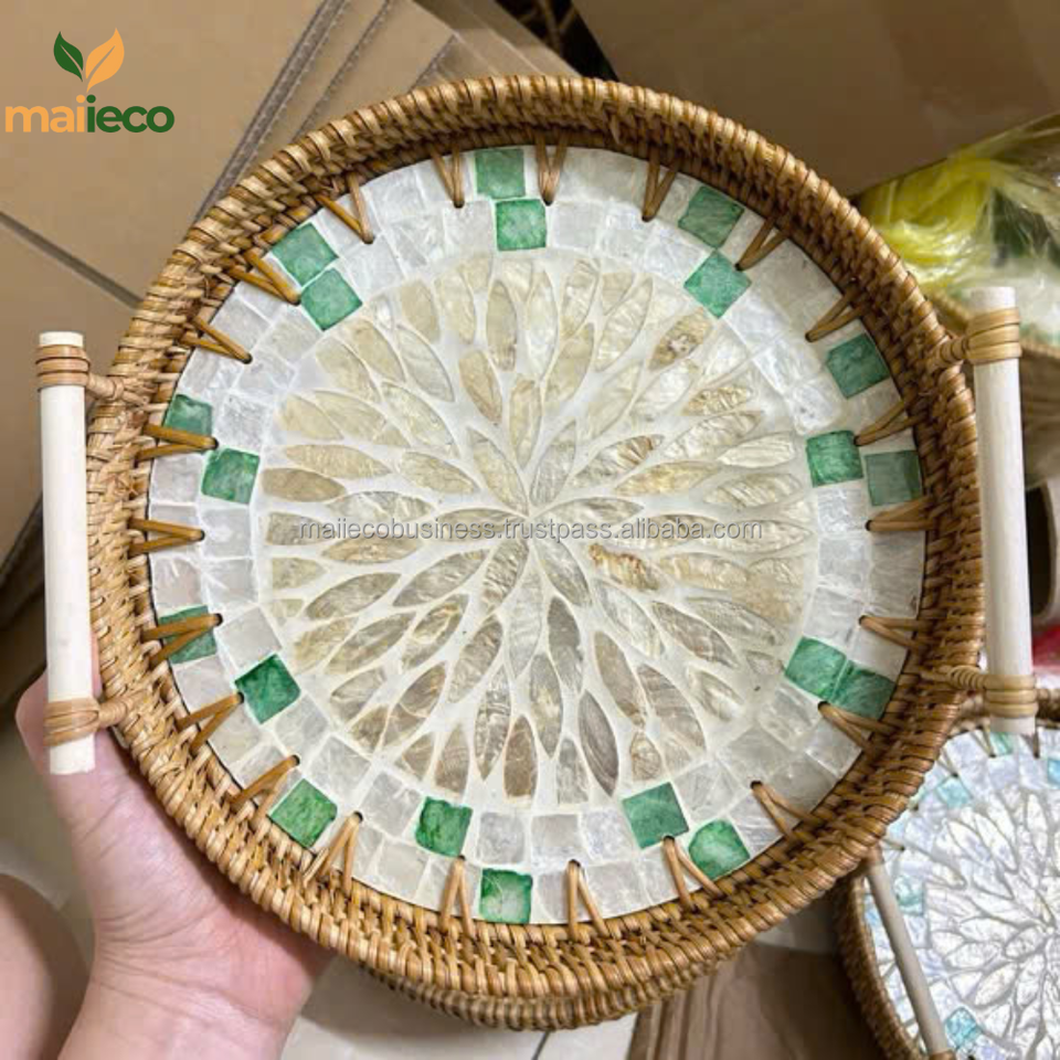ชื่อผลิตภัณฑ์:ถาดหวายทรงกลมพร้อมที่จับสำหรับคุณแม่ทำจากมุก