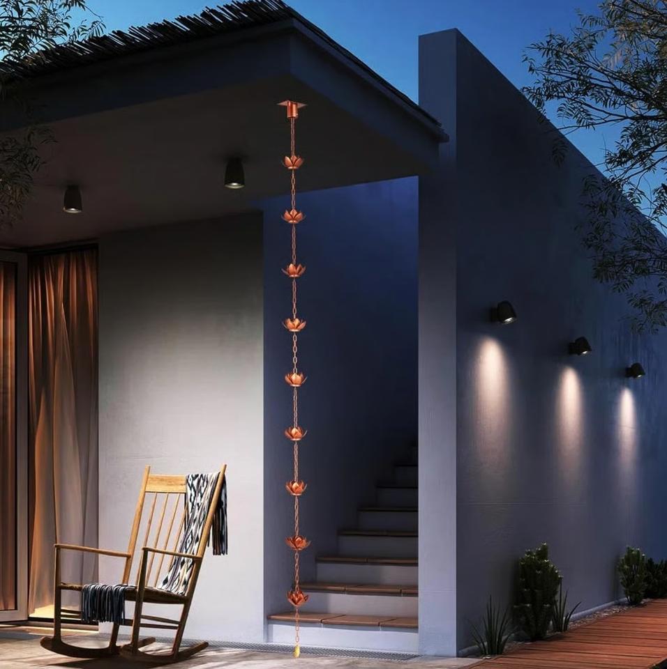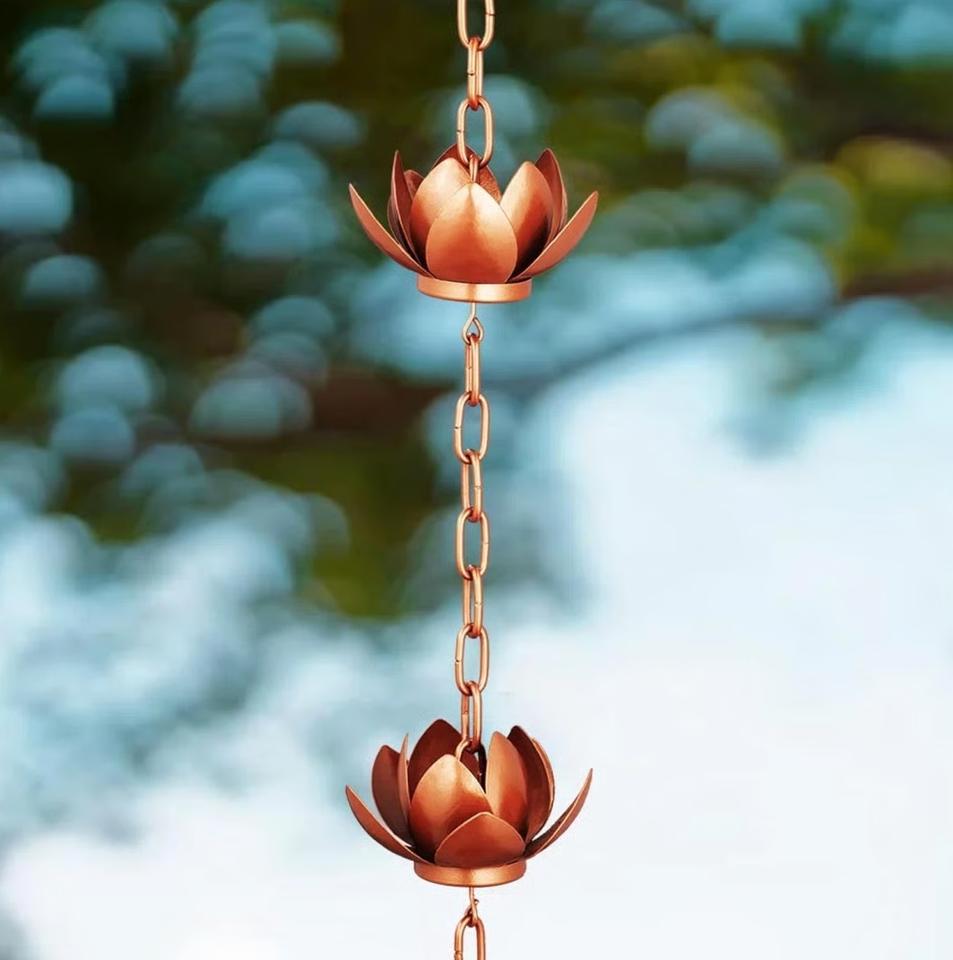 โซ่ฝนดอกบัวทองแดงหรูหราพร้อมถ้วยกลีบดอกดีไซน์ให้น้ำไหลลื่นทนทานต่อการตกแต่งสวนกลางแจ้ง