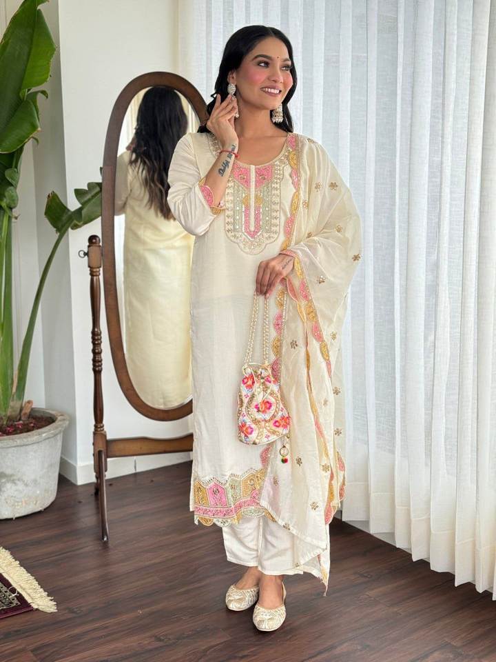 ชุดคุर्ติผ้าไหมโรมันสีครีมสุดหรู พร้อมงานปักทั้งตัว ประกอบด้วยกางเกงผ้าชานเดอร์รี ผ้าคลุมไหล่ผ้าฝ้ายดูปัตตา ความยาวคุर्ติ 44 นิ้ว