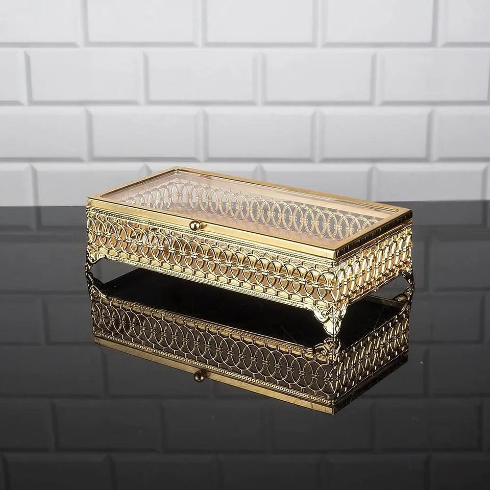 กล่องใส่เครื่องประดับโลหะและแก้วแบบปรับแต่งได้อย่างหรูหรา พร้อมกรอบสีทอง กล่องโชว์สินค้าสุดหรู