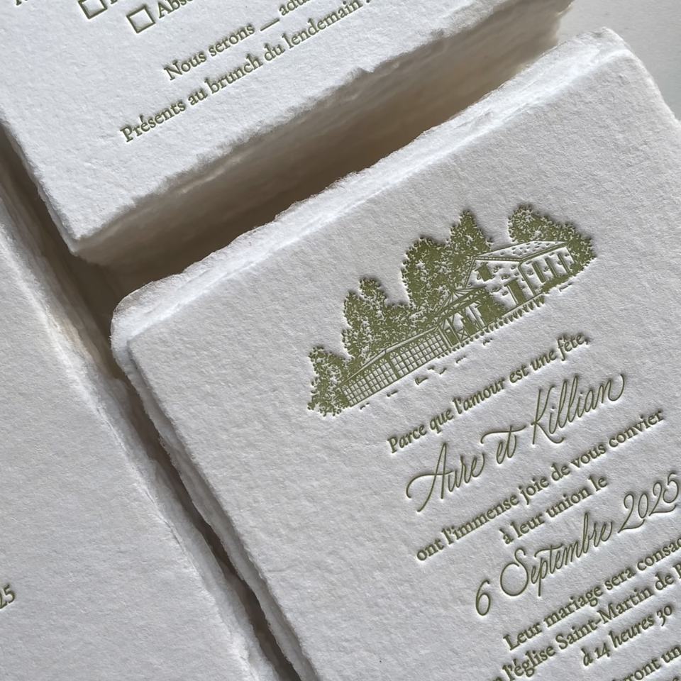 การ์ดเชิญ RSVP แบบกำหนดเองสุดหรู ทำมือ ลายนูน 3 มิติ ขอบกระดาษแบบดิบ กระดาษพรีเมียมและกระดาษแข็ง พิมพ์แบบ Letterpress