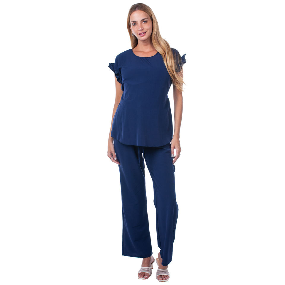 Elegant Dark Blue Maternity Set Women's Comfortable Short-Sleeved Blouse Pants for Sophisticated Pregnancy Look