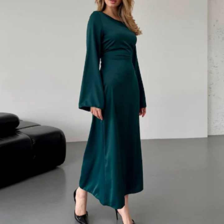 ชุดเดรสยาวผ้าไหมซาตินสีเขียวเข้มหรูหรา แขนยาวทรงระฆัง ผูกเอว เปิดหลัง ชุดราตรีสำหรับโอกาสพิเศษ