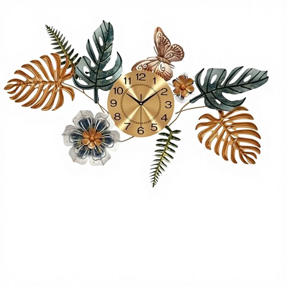 งานศิลปะตกแต่งผนังห้องนั่งเล่นสุดหรู รูปใบไม้เขตร้อนประดับดอกไม้เหล็กดัด พร้อมนาฬิกาแขวนผนัง