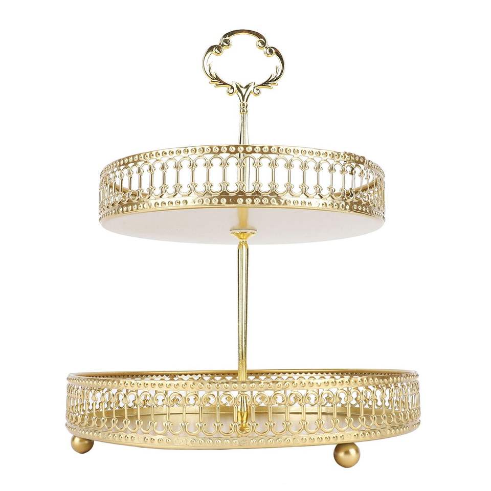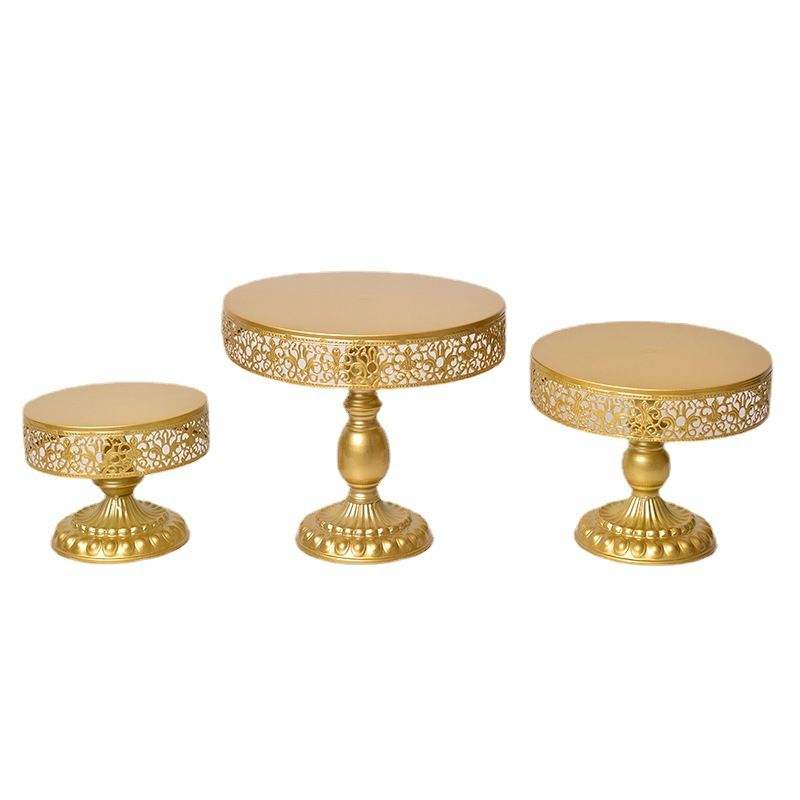 ขาตั้งเค้กโลหะตกแต่งสวยงามสำหรับร้านเบเกอรี่ จัดแสดงขนมหวาน พร้อมฐานทรงสูงทันสมัยและจานทรงกลม