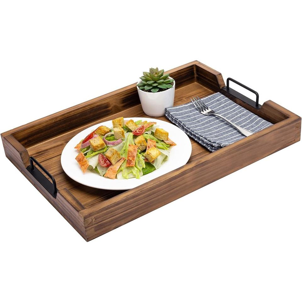 ถาดเสิร์ฟไม้ทรงกลมตกแต่งสวยงามพร้อมหูจับ สำหรับอาหารเช้า กาแฟ ของว่าง งานเลี้ยง และตกแต่งบ้าน