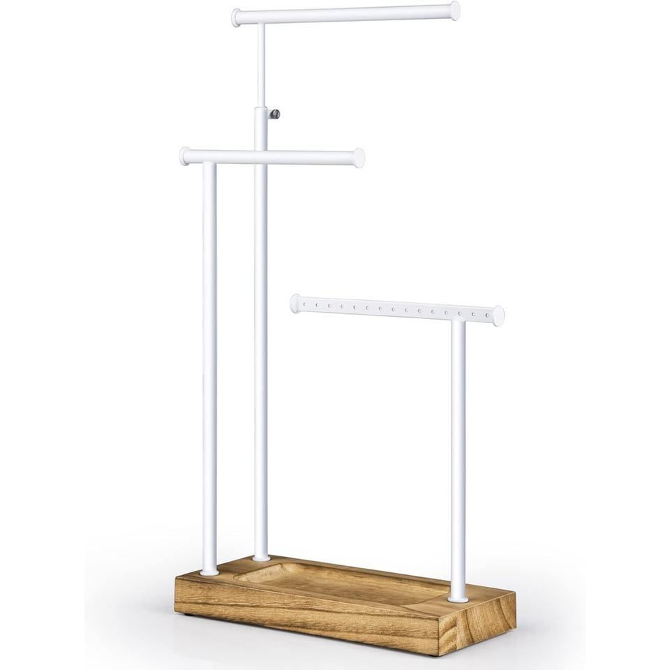 ที่ตั้งโชว์ต่างหูเครื่องประดับสีขาว3ชั้นดีไซน์หรูหราพร้อมฐานไม้อุปกรณ์เครื่องประดับทันสมัย