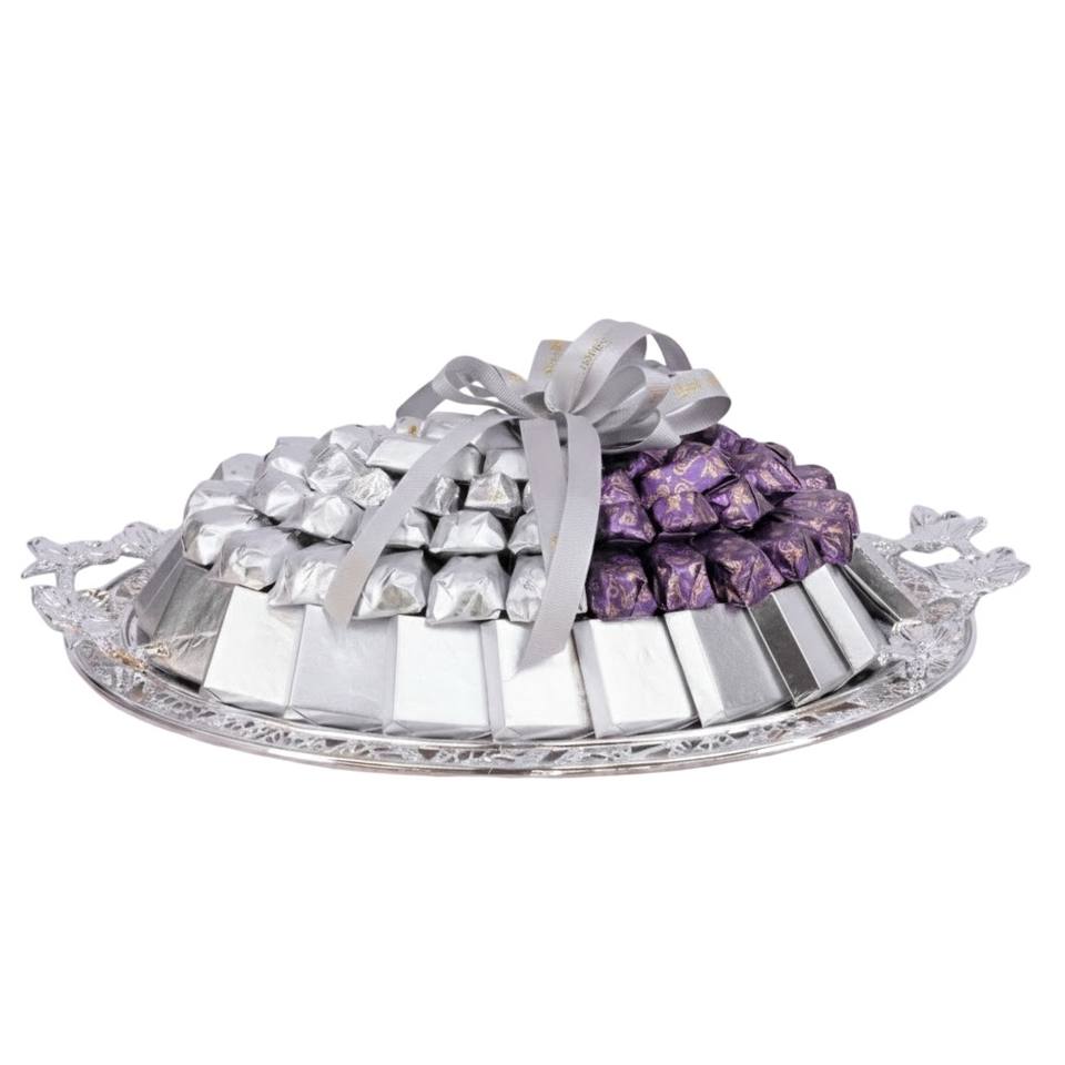 ถาดเสิร์ฟช็อกโกแลตสีเงิน ดีไซน์หรูหรา ชุดของขวัญช็อกโกแลตสุดหรู ถาดเสิร์ฟขนมหวานสำหรับงานแต่งงานระดับพรีเมียม จานเสิร์ฟช็อกโกแลต