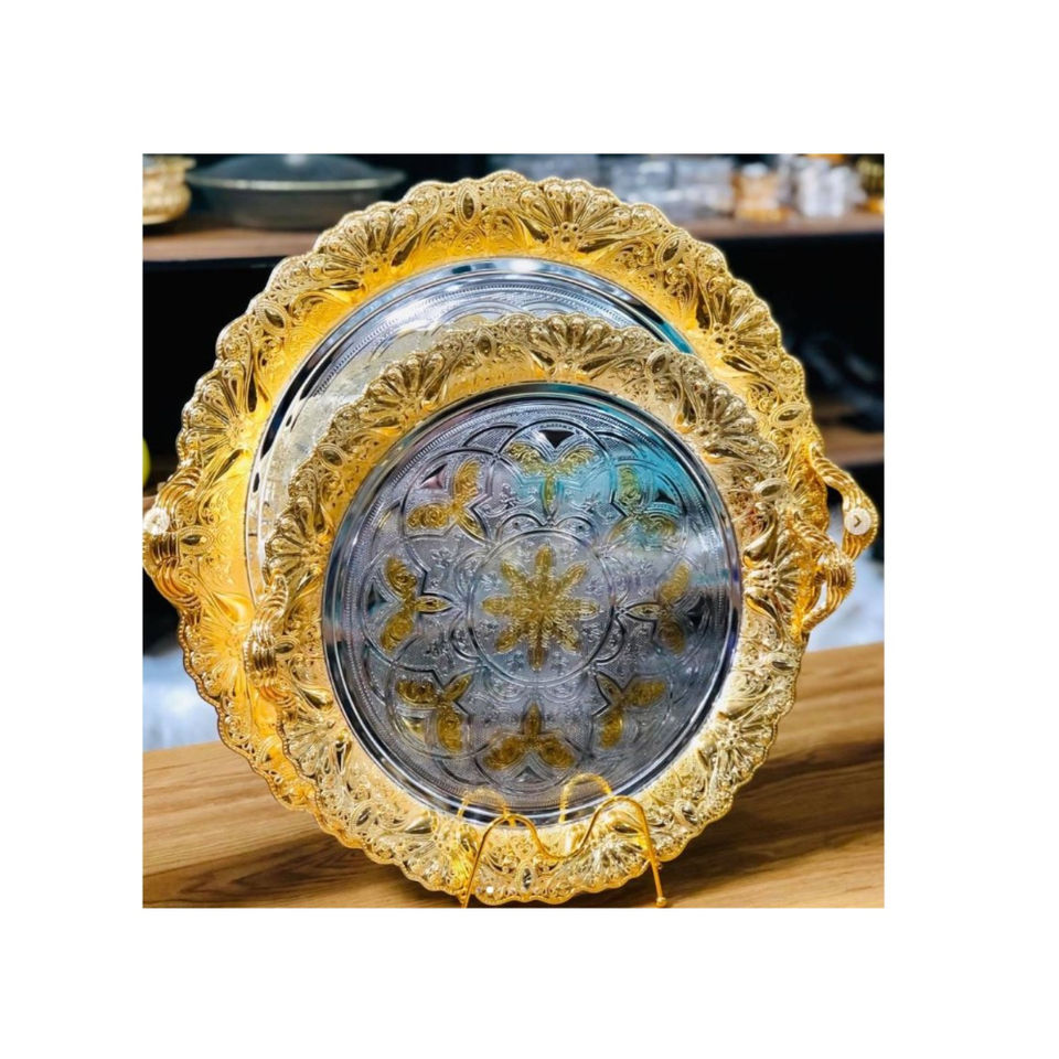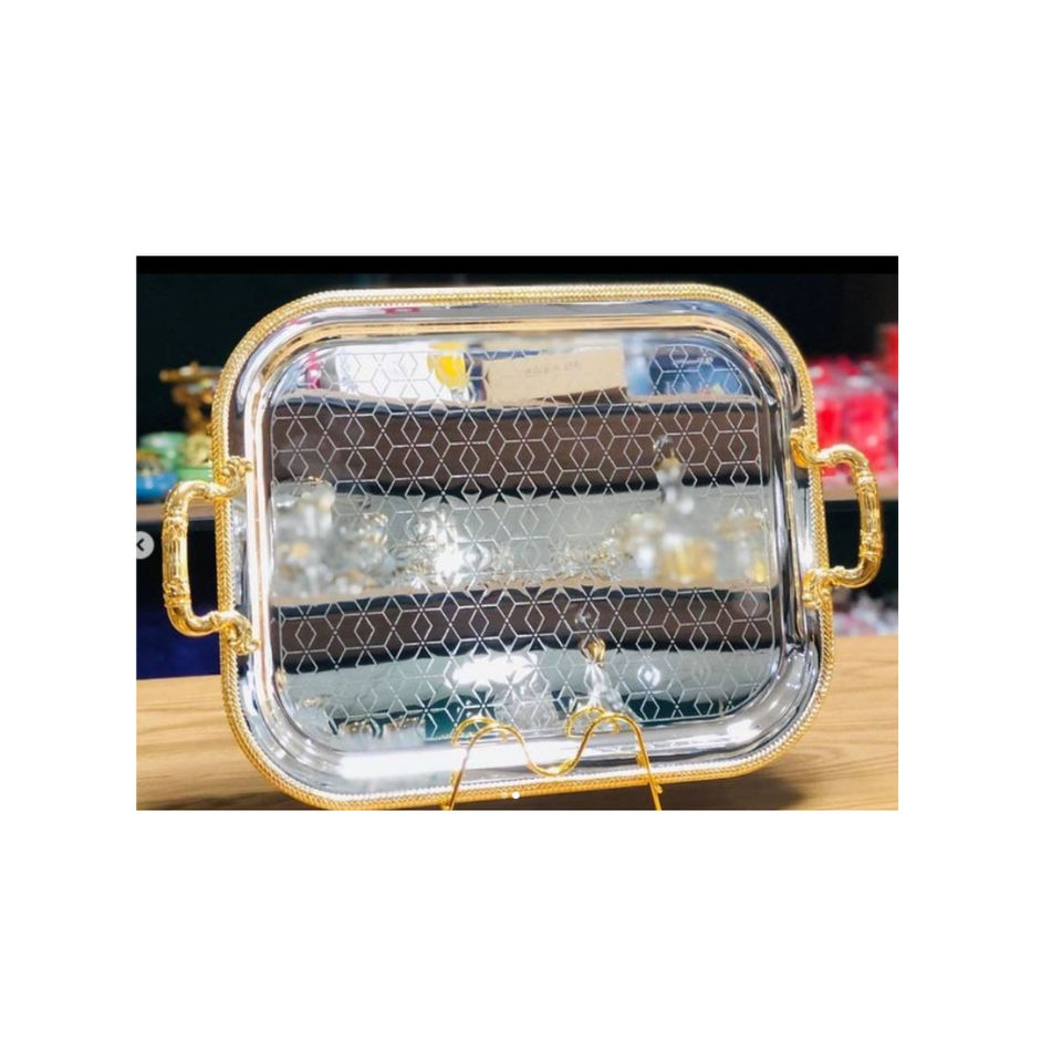 ถาดสีเงินดีไซน์หรูหราพร้อมที่จับทําจากถาดตกแต่งโต๊ะสแตนเลสซัพพลายเออร์อุปกรณ์โรงแรมในราคาต่ํา