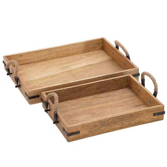 ถาดไม้ทรงสี่เหลี่ยมผืนผ้าพร้อมที่จับเชือกสำหรับใช้ในบ้านถาดเสิร์ฟอาหารชากาแฟ