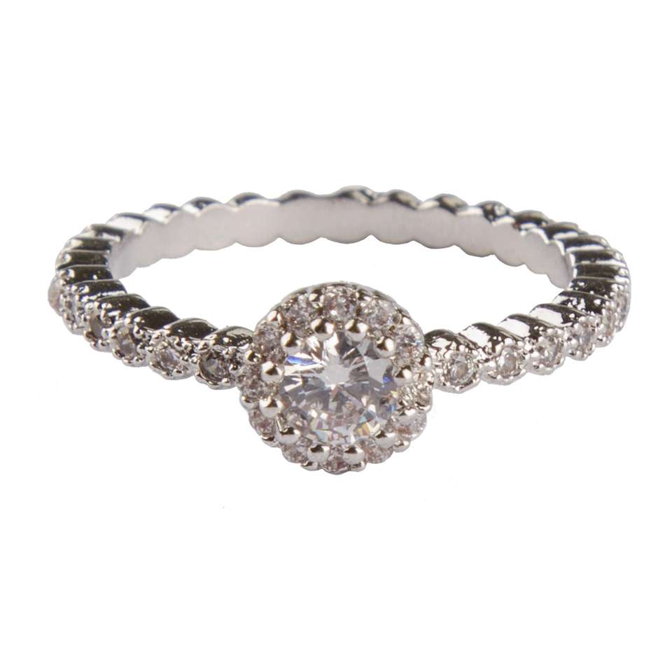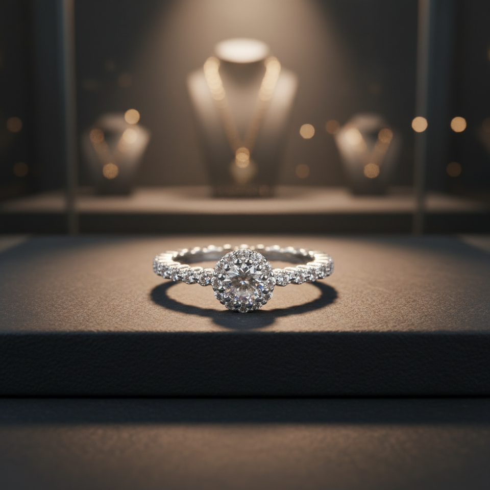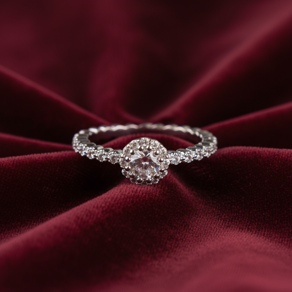 แหวนเพชรทรงหรูหราประดับเพชรเม็ดกลมตรงกลางและแถบเพชรแบบ Pave ตัวเรือนทองคำขาว สำหรับผู้หญิง เหมาะสำหรับงานหมั้นและสวมใส่ในชีวิตประจำวัน