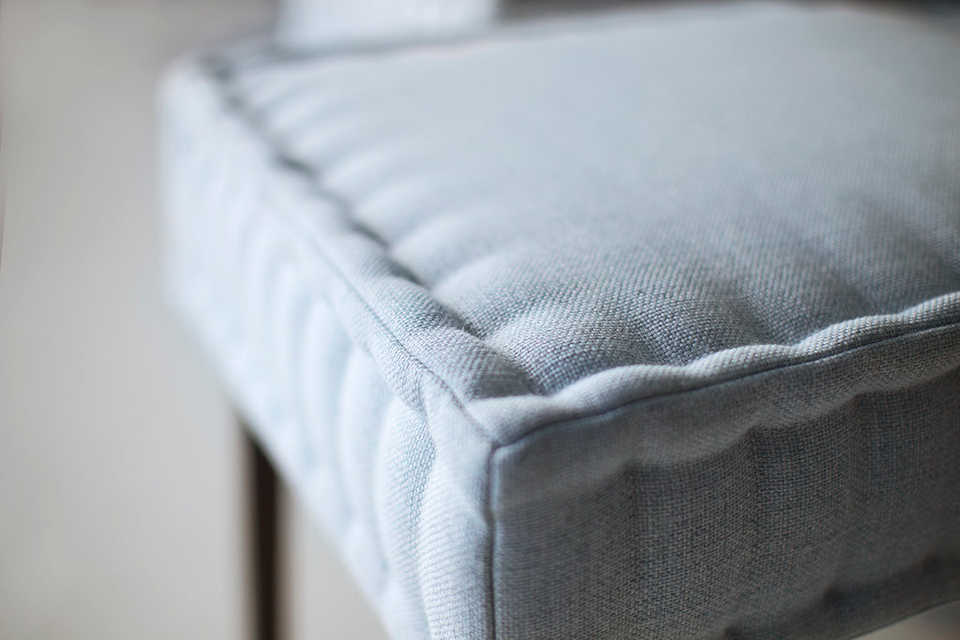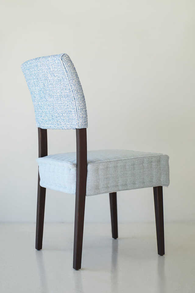 เก้าอี้รับประทานอาหารสุดหรูพร้อมกรอบไม้เคลือบพนักพิงเบาะและที่นั่งบุนวมสีฟ้าเหมาะสำหรับพื้นที่รับประทานอาหารที่ทันสมัย