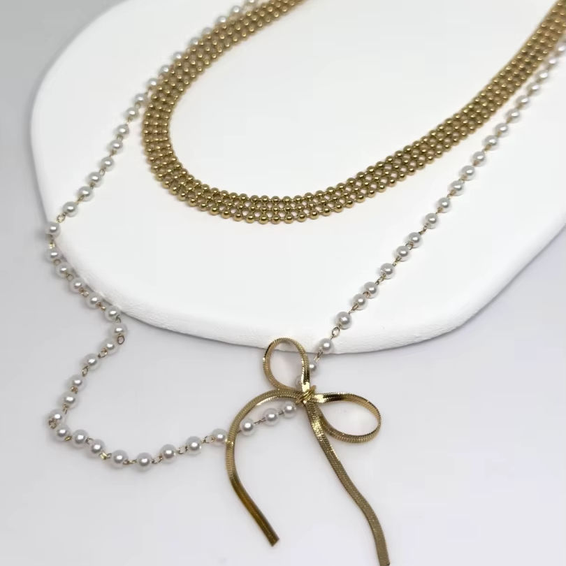 สร้อยคอสแตนเลสคู่ที่สง่างามประดับโบว์ไข่มุกสีทองโรเดียมสไตล์ทางศาสนาคลาสสิก