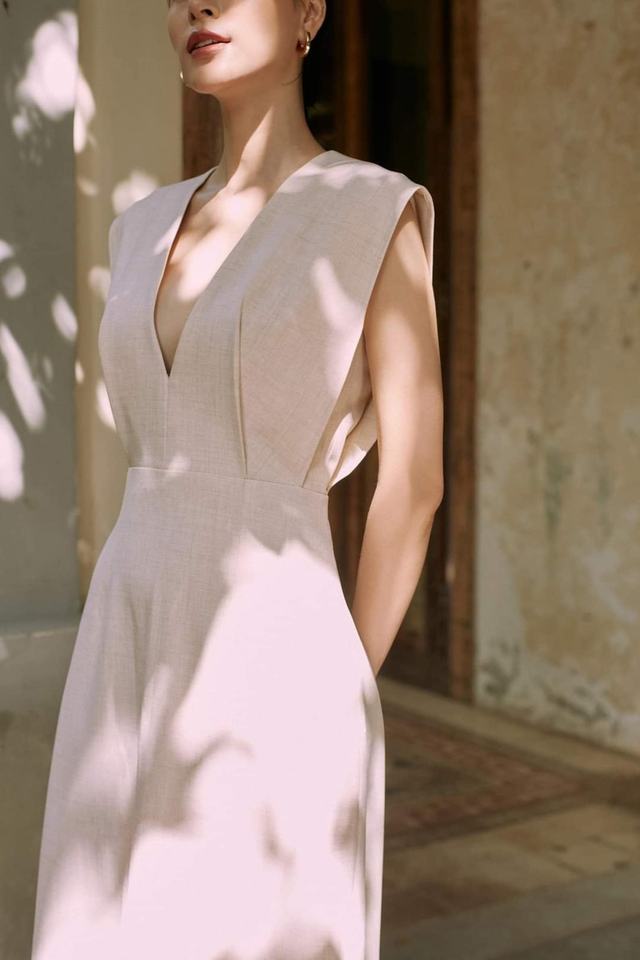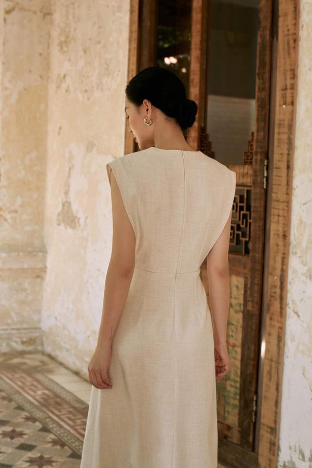ชุดเดรสแม็กซี่ผ้าลินินเป็นมิตรต่อสิ่งแวดล้อมแขนกุดคอลึกมีกระดุมแบบเรียบง่ายมีกระเป๋าไซส์ใหญ่ให้เลือกมากมาย