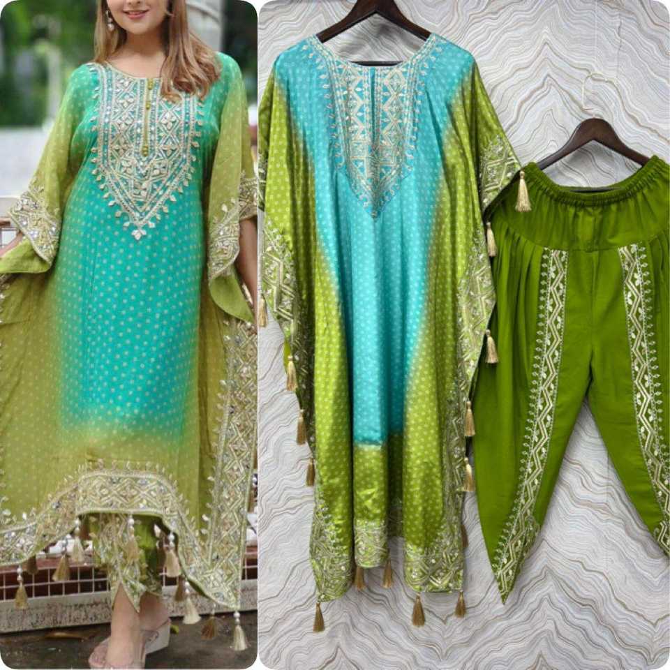 ชุดเดรสลำลองผ้าไหมชีฟองปักลายหรูหราประดับเพชรพลอยและเลื่อม พร้อมกางเกงโดติเอวธรรมชาติแต่งลูกไม้หวาน