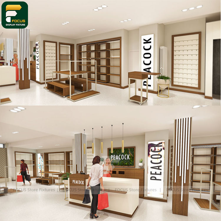 ชั้นวางโชว์สินค้าแฟชั่นสุดหรู ตู้แขวนเสื้อผ้าติดผนังแบบมีไฟส่องหลัง พื้นที่จัดแสดงสินค้า