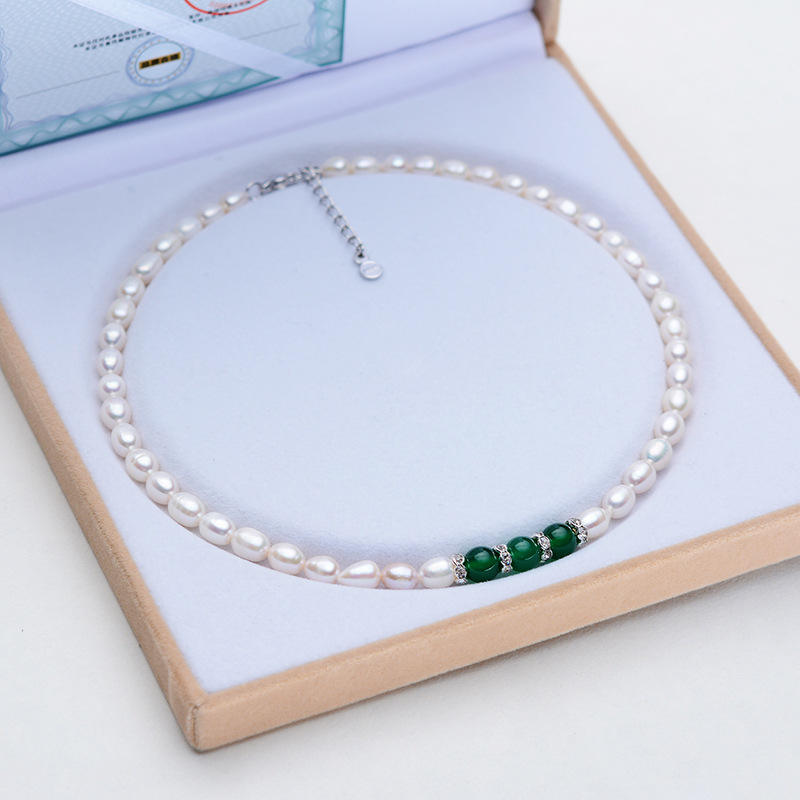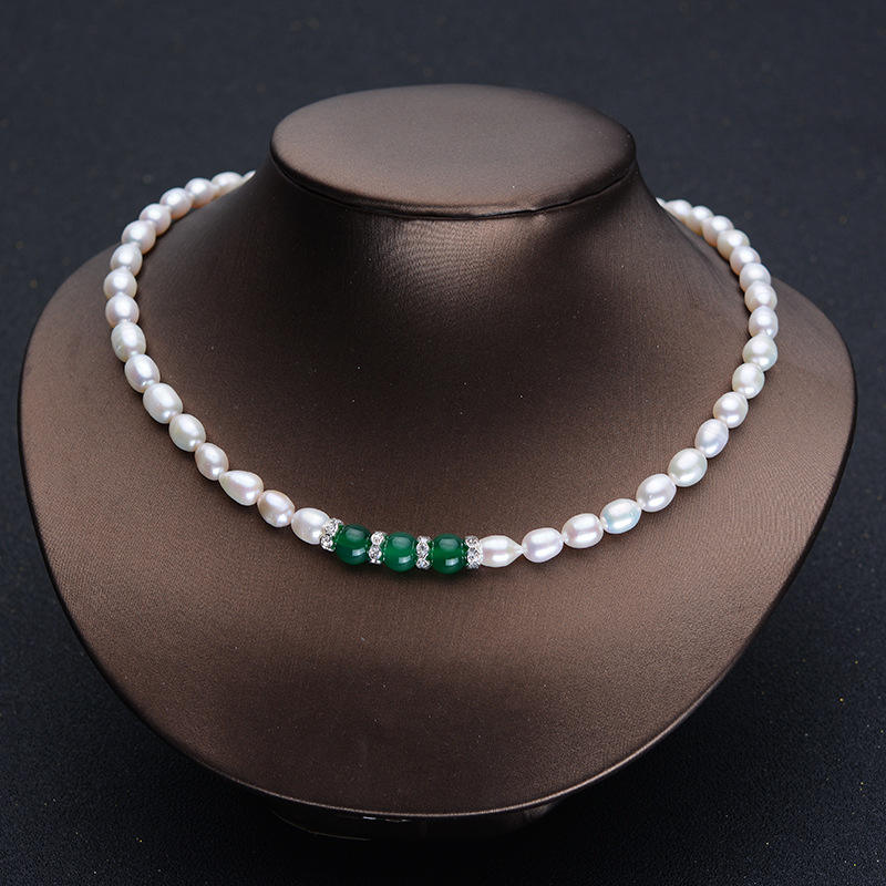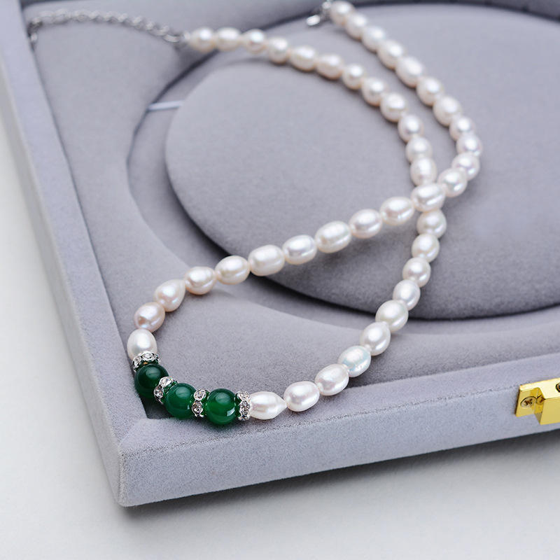 สร้อยคอมุกน้ำจืดทรงข้าวขนาด 7-8 มม. ดีไซน์หรูหราทันสมัยสำหรับผู้หญิง พร้อมสร้อยคอหินอาเกตสีเขียว ประเภทสินค้า