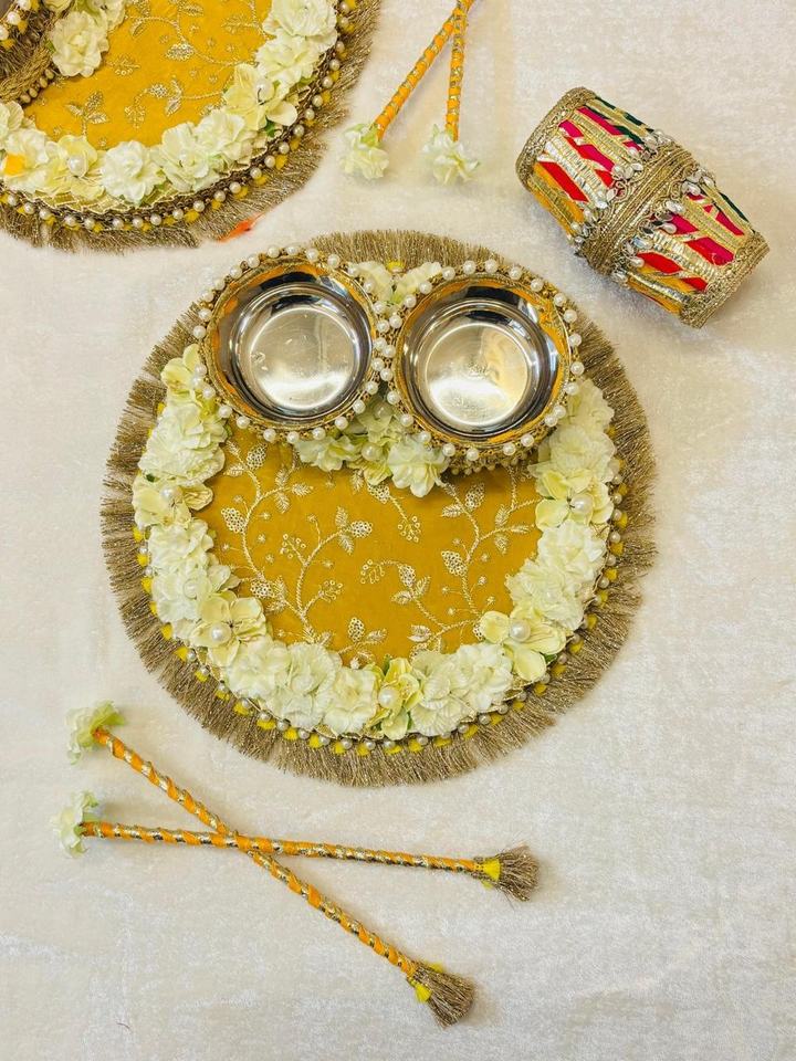 ชุดถาดบูชาประดับดอกไม้สวยงาม พร้อมที่ใส่กุมกุมคู่ ขอบมุกและพู่ห้อยประดับ งานฝีมือสำหรับพิธีกรรมในเทศกาล