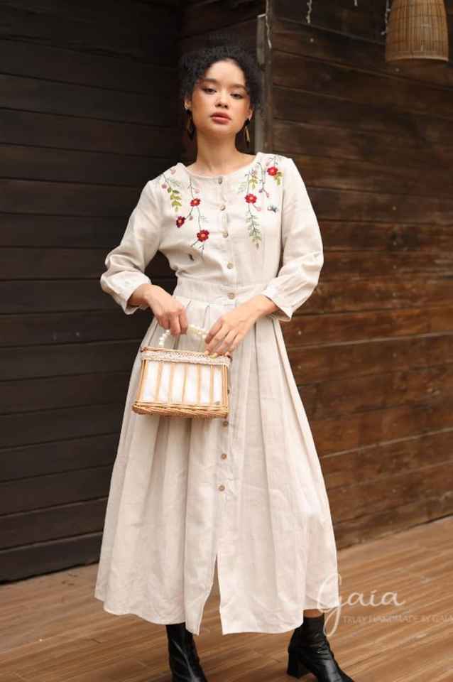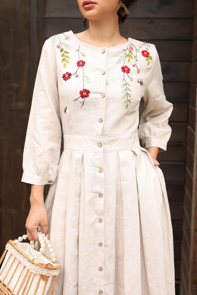 Elegant Floral Embroidered Linen Dress FIONA With Front Buttons For Wedding Guest Style