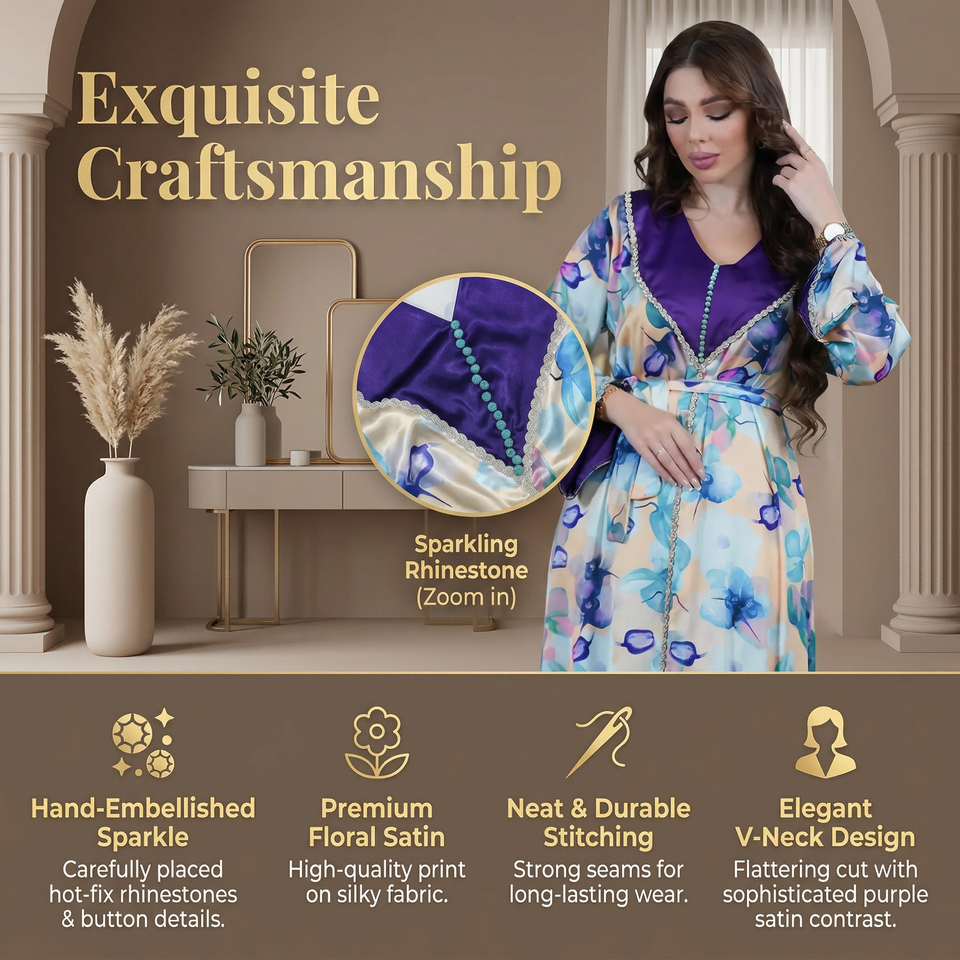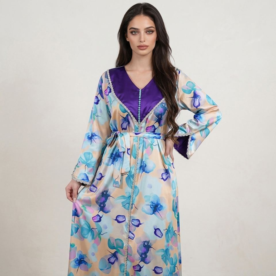 ชุดอาบายะห์พิมพ์ลายดอกไม้หรูหราประดับเพชรพร้อมเข็มขัดสำหรับผู้หญิงมุสลิม ขายส่งราคาโรงงาน