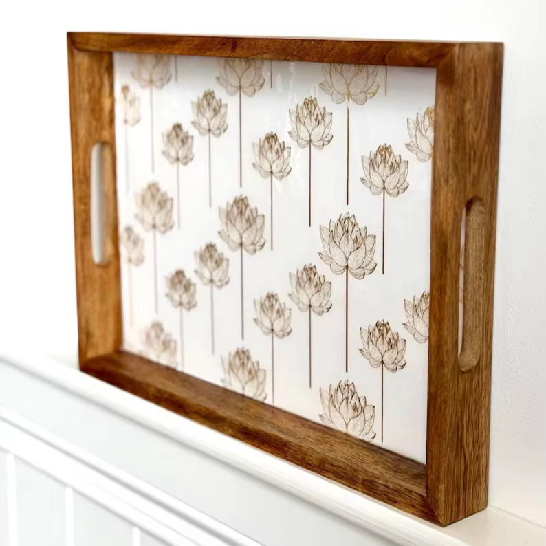 ถาดเสิร์ฟไม้ลายดอกไม้สวยๆกรอบไม้ธรรมชาติทนทานลายดอกบัวตกแต่งได้หลากหลาย