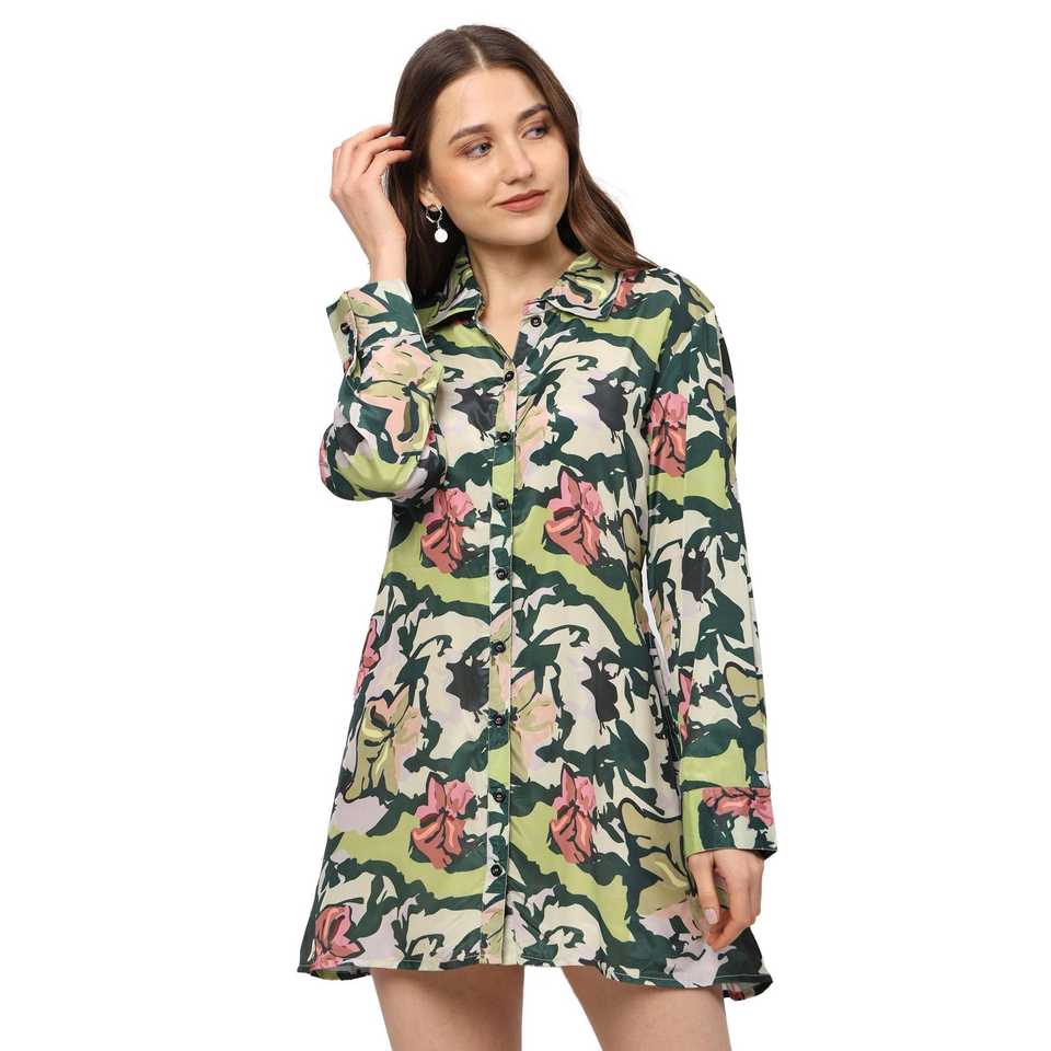 เดรสผ้าโพลีเอสเตอร์พิมพ์ลายดอกไม้สีเขียวแบบทางการหรูหราซักได้ลายดอกแบบถักขนาดเล็ก/สั้นสีเขียวแบบลำลอง