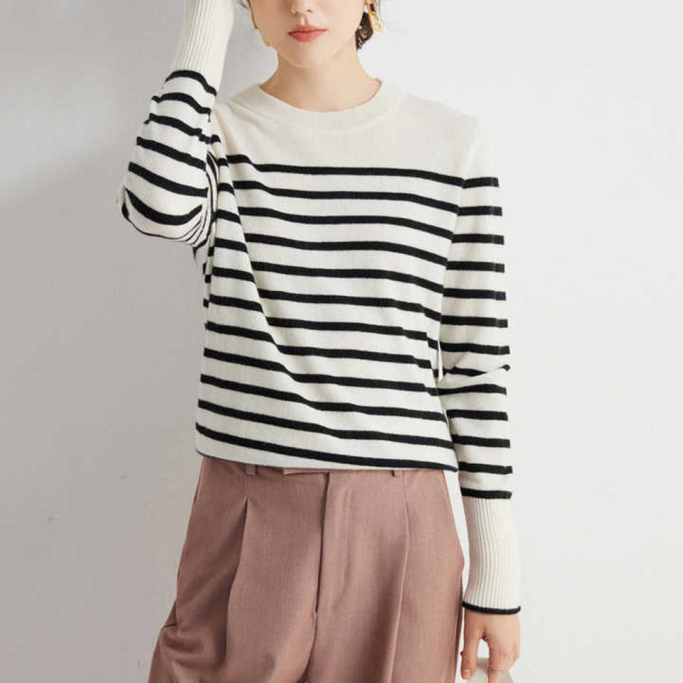 เสื้อสเวตเตอร์ผ้าแคชเมียร์ผสมลายทางฝรั่งเศส ดีไซน์หรูหรา คอกลม แขนจั๊มเนื้อนุ่ม สไตล์แฟชั่นระดับไฮเอนด์ สวมใส่สบาย ไซส์สำหรับผู้หญิง