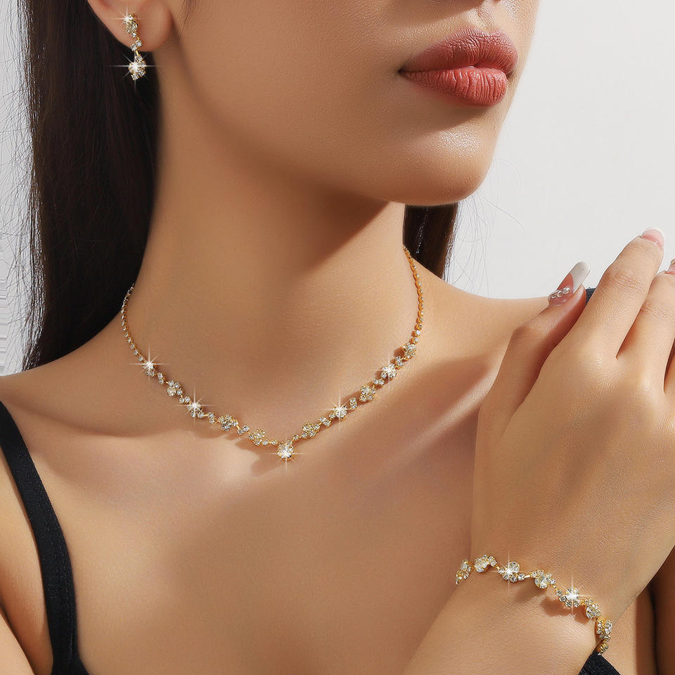 ชุดเครื่องประดับเพชรเทียม 3 ชิ้น ดีไซน์หรูหรา ประกอบด้วยสร้อยคอ ต่างหู และกำไลข้อมือ ชุบทอง เหมาะสำหรับงานกลางคืน ขายส่ง