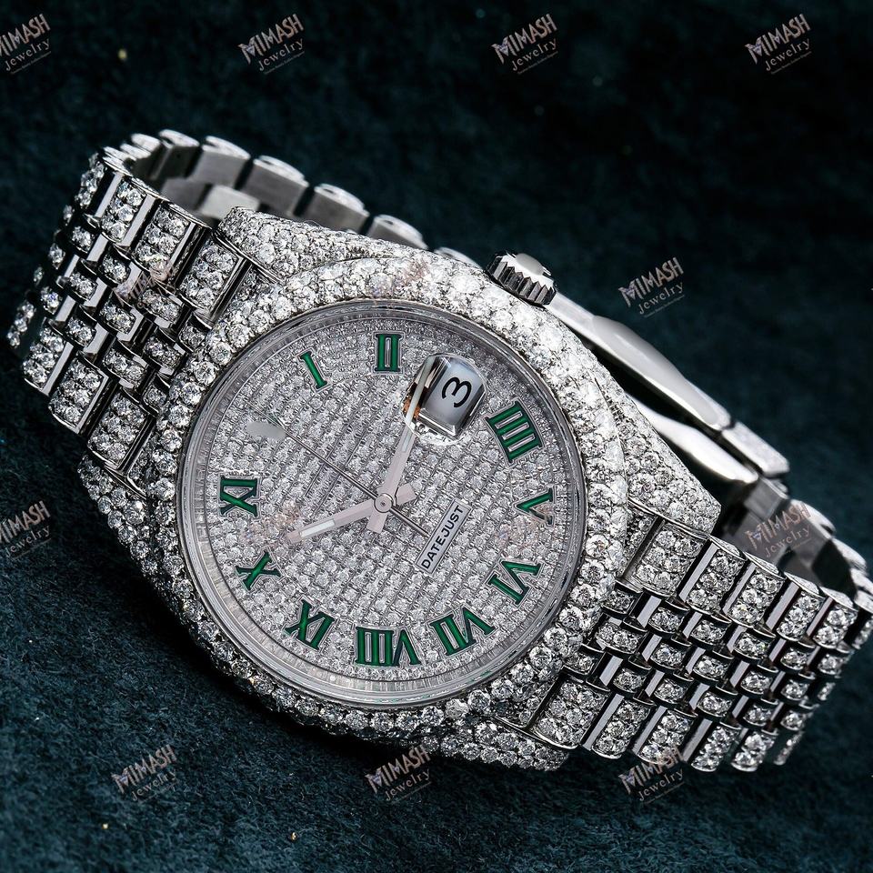 นาฬิกาสีเงินสุดหรูที่มีตัวเลขโรมันสีเขียวและสร้อยข้อมือประดับเพชร