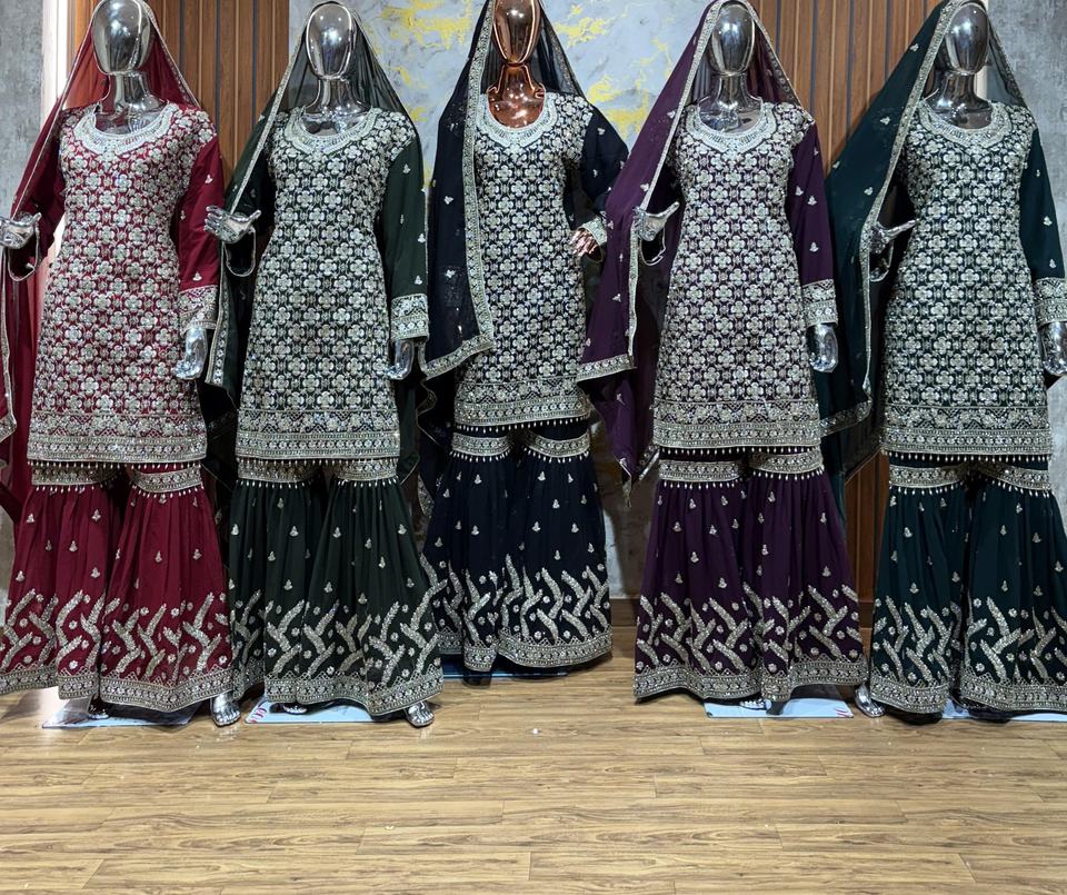 การเย็บปักถักร้อยด้านหน้าและด้านหลังแบบหรูหรา georgette gharara, หิน zarkan, dupatta หนักที่มีเส้นขอบ (ชุดขายส่ง5ชิ้น)
