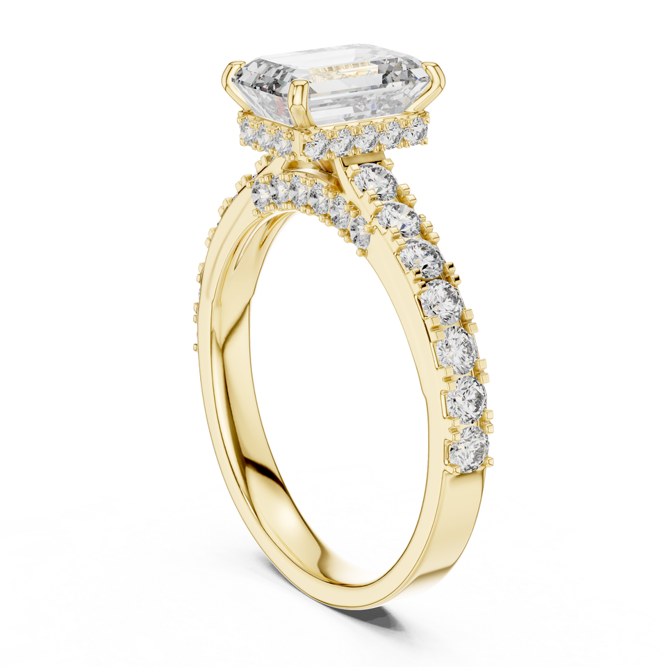 แหวนหมั้นเพชรทรงเหลี่ยมมรกตสีทองหรูหรา เพชรสร้างในห้องปฏิบัติการพร้อมวงแหวนแบบฝังเพชรสองชั้น เครื่องประดับเพชรเจ้าสาวสไตล์โมเดิร์น