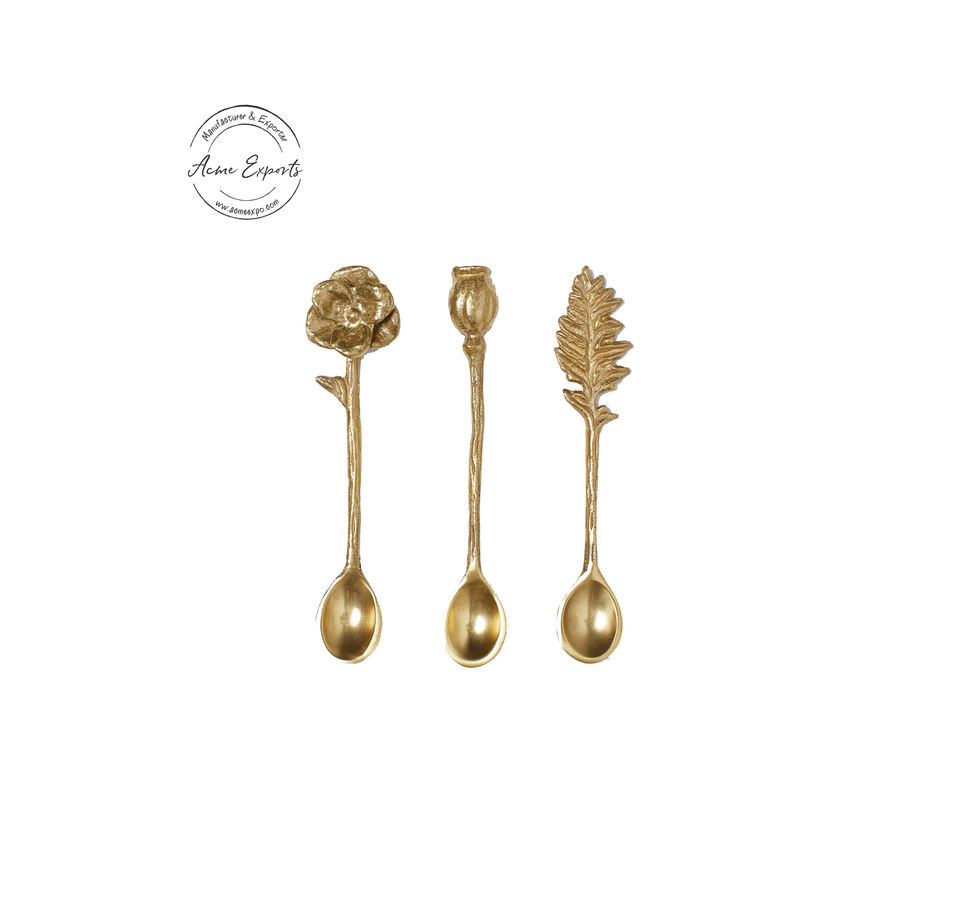 ชุดช้อนชาทองเหลืองเคลือบทองหรูหรา3ชิ้นมีดีไซน์ดอกไม้และใบไม้จุได้10มล. สำหรับเป็นของขวัญรับประทานอาหารและตกแต่งบ้าน
