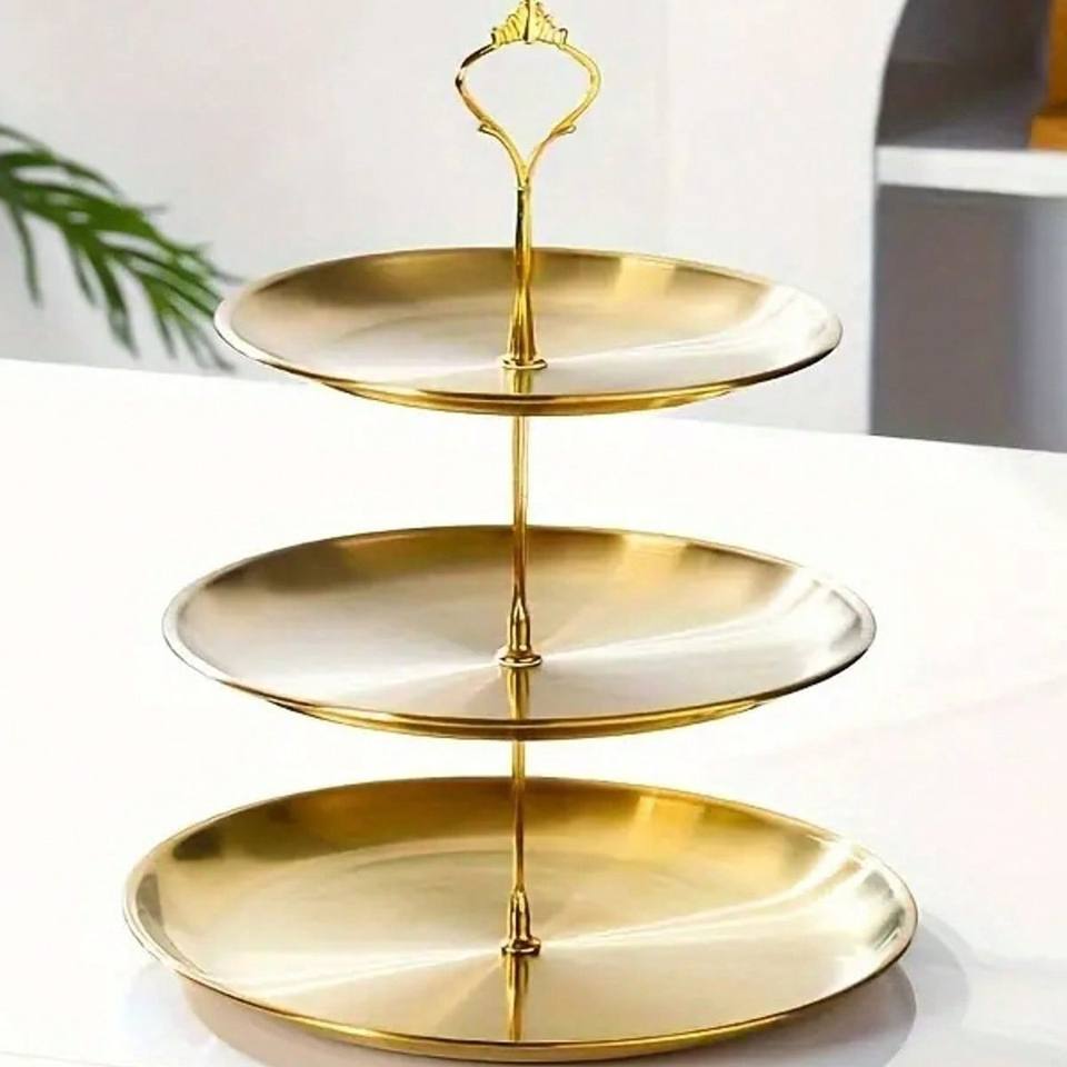 ถาดทองเหลืองเคลือบทองหรูหราสองชั้นสำหรับขนมสำหรับน้ำชายามบ่ายและการตกแต่งโต๊ะบ้านสไตล์โมเดิร์น
