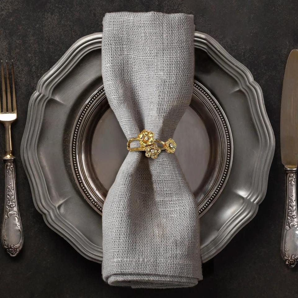 แหวนรองผ้าเช็ดปากลายดอกไม้สีทองหรูหรา ที่วางผ้าเช็ดปากลายดอกไม้โลหะ ของตกแต่งโต๊ะคริสต์มาส แหวนรองผ้าเช็ดปากลายดอกไม้สีทองสามชั้นสุดหรู