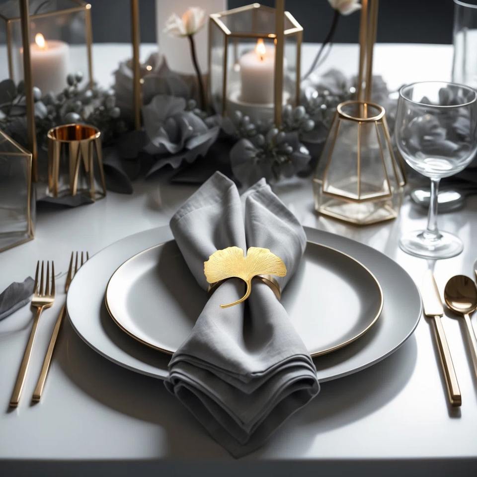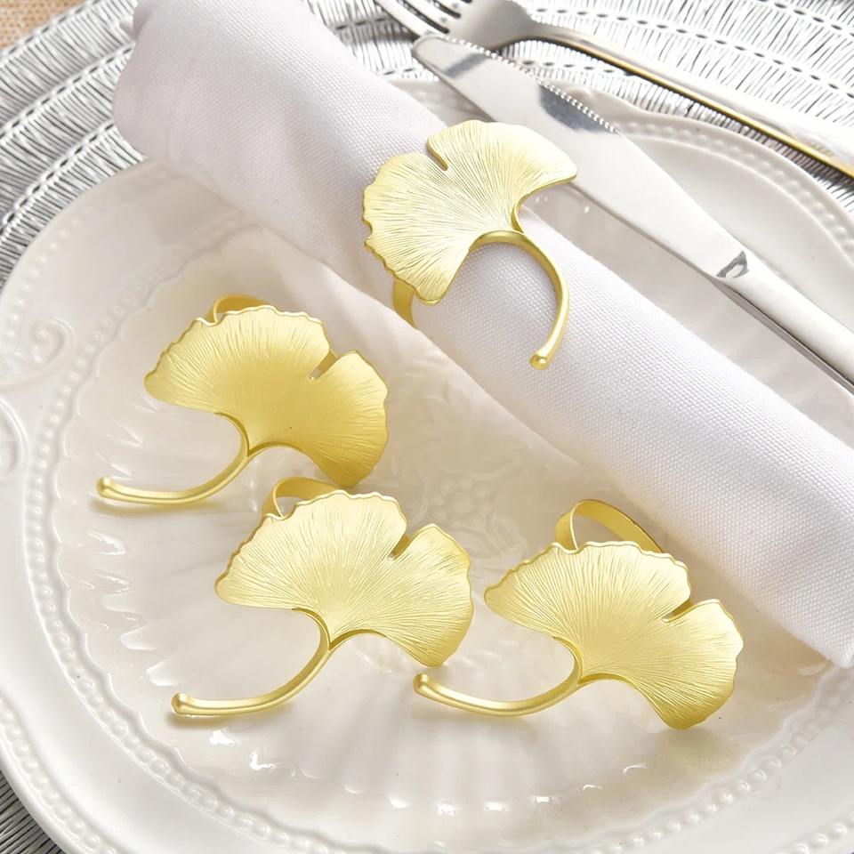ชุดแหวนรองผ้าเช็ดปากรูปใบแปะก๊วยสีทองหรูหรา 4 ชิ้น ของตกแต่งโต๊ะคริสต์มาส ที่วางผ้าเช็ดปากใบแปะก๊วยสีทองเมทัลลิกสุดหรู