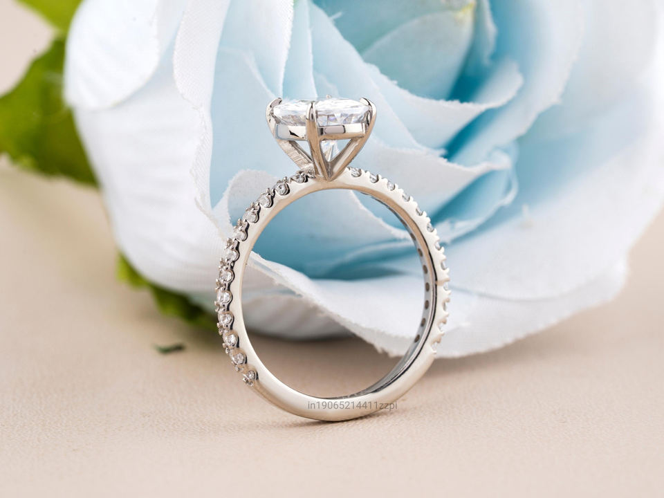 แหวนหมั้น925ชุบทองหรูหราสำหรับผู้หญิง D สีสดใสพร้อมศูนย์เพชรโมอิสทรงรีตัด