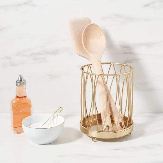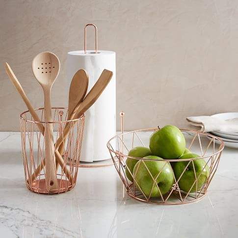 ตะกร้าเครื่องครัวชุบทองหรูหราพร้อมเคาน์เตอร์ทำจากโลหะสำหรับวางกลางโต๊ะรับประทานอาหารใช้ในบ้าน
