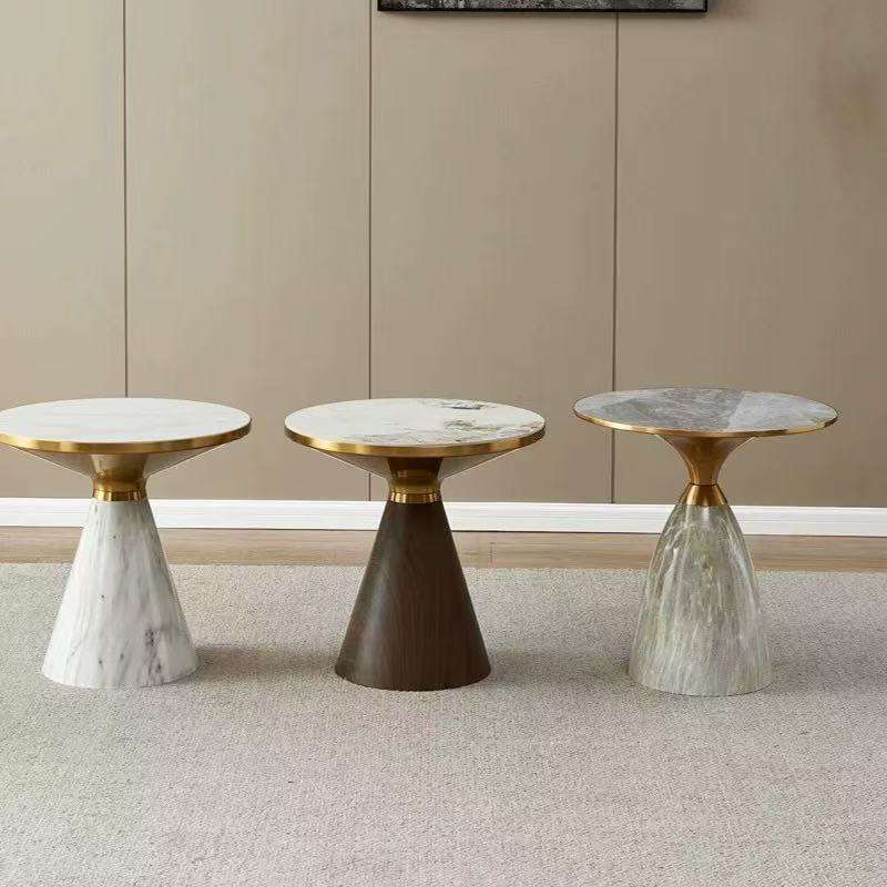 โต๊ะข้างหินอ่อนขอบทองหรูหรา ฐานไม้ทรงกรวย โต๊ะกาแฟสำหรับอพาร์ทเมนต์