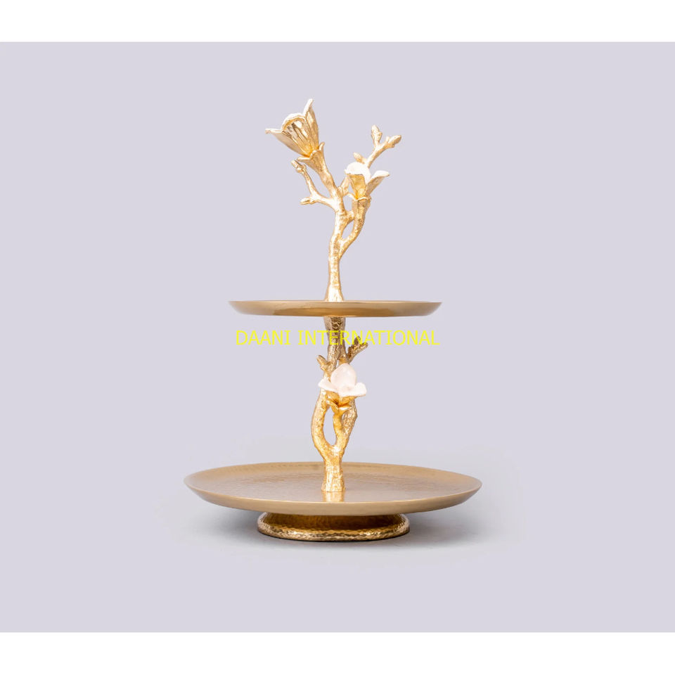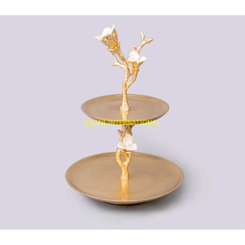 ที่วางเค้กสองชั้นสีทองหรูหราถาดโลหะลายดอกไม้สำหรับตกแต่งบ้านสำหรับงานเลี้ยงขนมและของหวาน