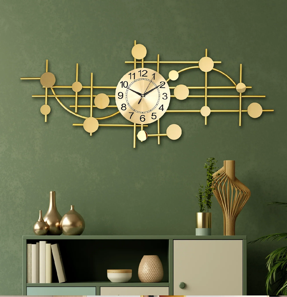 นาฬิกาแขวนผนังสีทองหรูหราพร้อมการออกแบบทางเรขาคณิตที่เป็นนามธรรมและตารางของสายเชื่อมต่อ