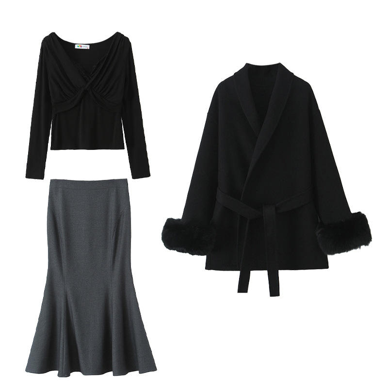 สี:กระโปรงสีเทา Midi ระดับไฮเอนด์ เสื้อสีดำ เสื้อโค้ทสีดำคลาสสิก