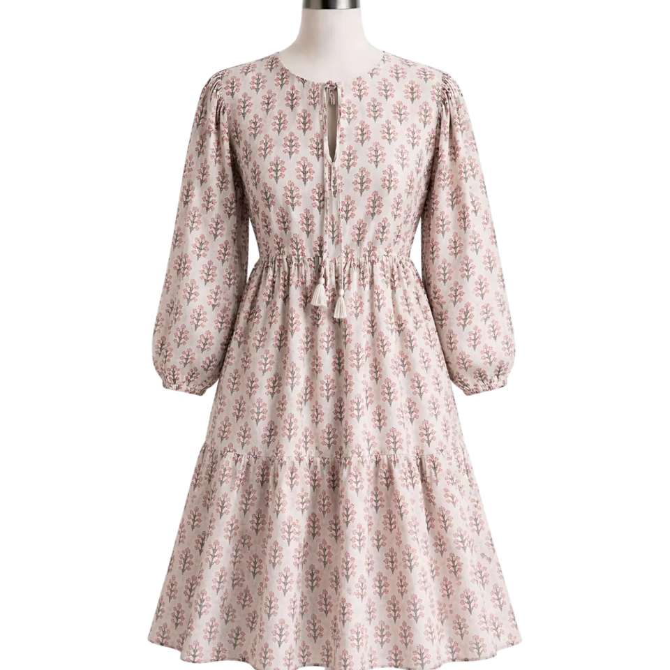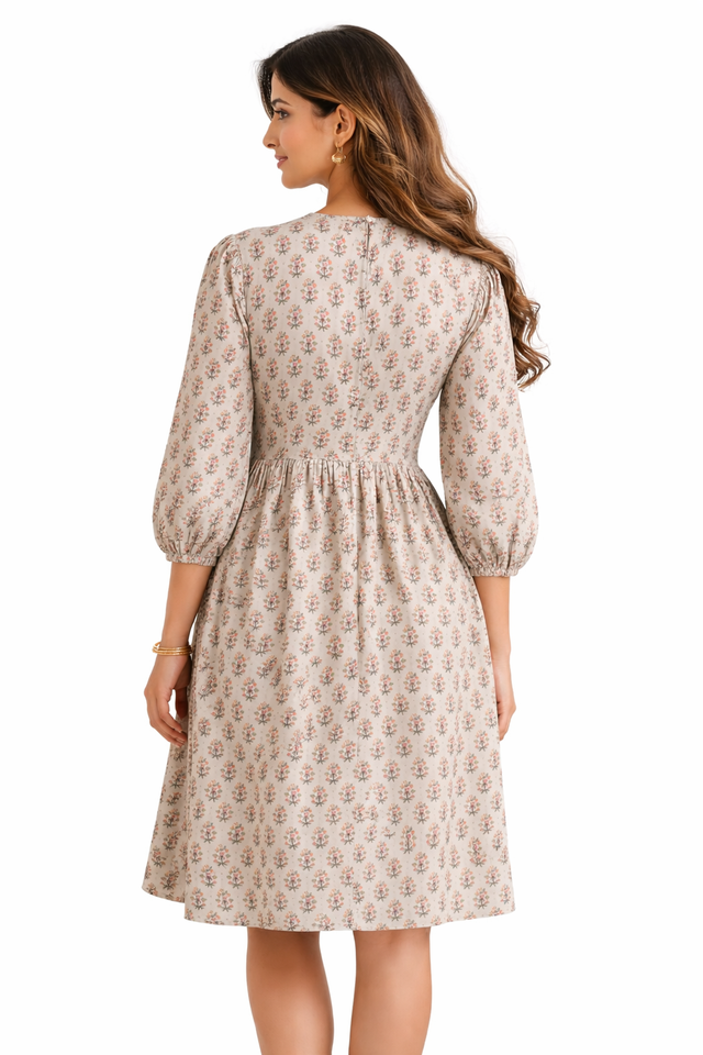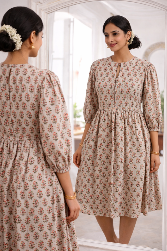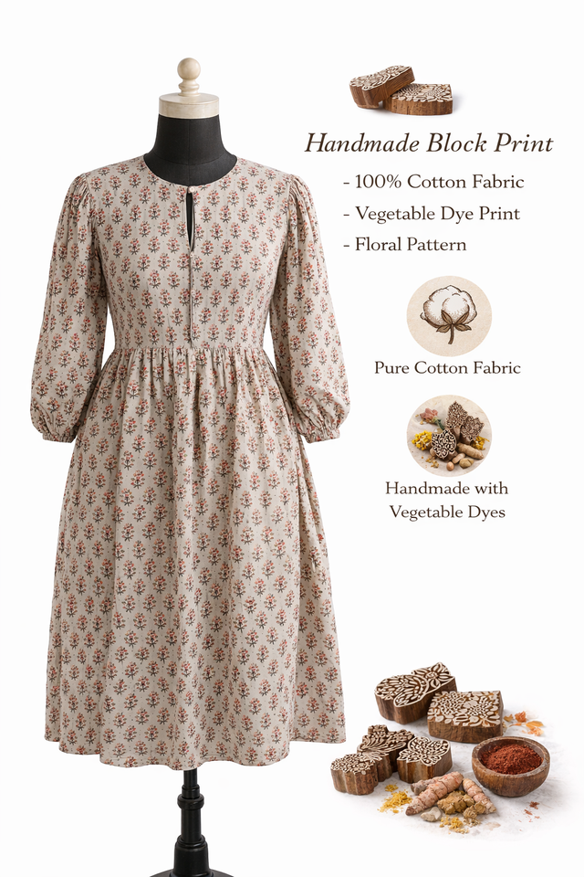 ชุดเดรสลำลองผู้หญิงลายดอกไม้สีเทาสุดหรู พิมพ์ลายด้วยมือ คอกลม แขนยาว มีกระเป๋าข้าง ใส่สบาย