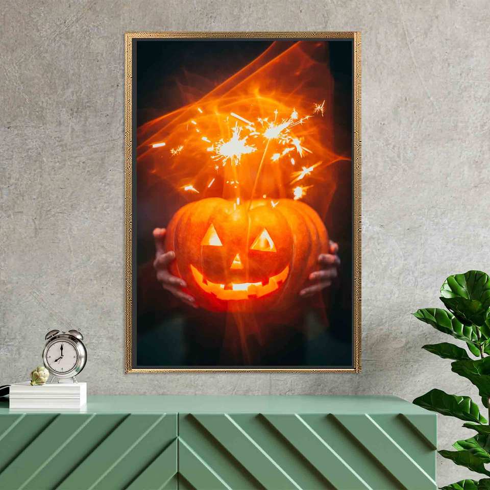 งานศิลปะบนผ้าใบพิมพ์ลายฟักทองฮาโลวีนสุดหรูสำหรับการตกแต่งสไตล์โมเดิร์น ผ้าใบกรอบสีทอง