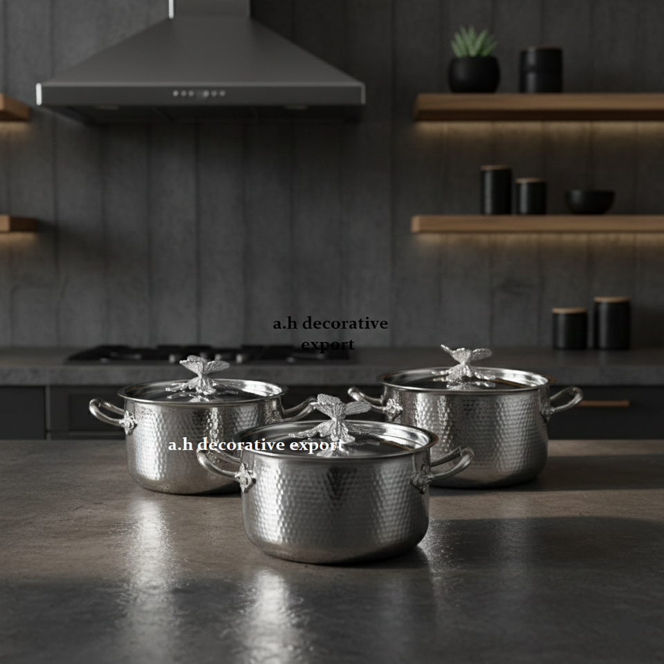 ชุดหม้อทำอาหารสไตล์ยุโรปตีขึ้นรูปด้วยมือ พร้อมหูจับรูปผีเสื้อตกแต่ง ผลิตจากสแตนเลสคุณภาพพรีเมียม ขัดเงาอย่างดี